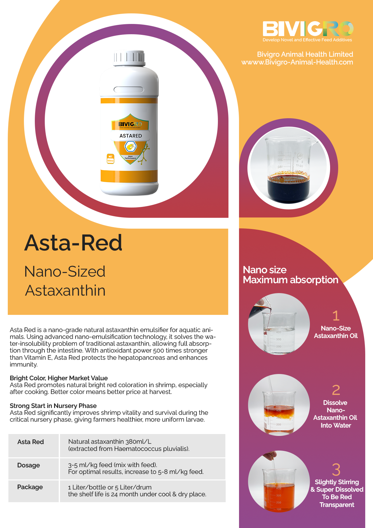 Asta Red is 100% natural, derived from Haematococcus pluvialis, and free from additives. Simply mix 3–5 mL per kg of feed (increase to 5–8 mL during stress or pre-harvest) for visible results in health, color, and performance.