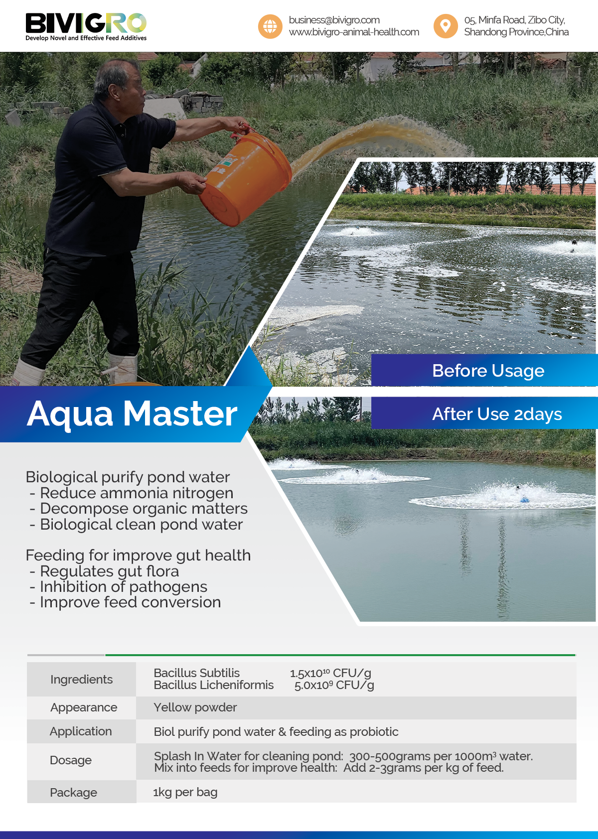 (5) Versatile & Easy to Use: Can be applied directly to the pond or mixed into feed, offering flexible management options.