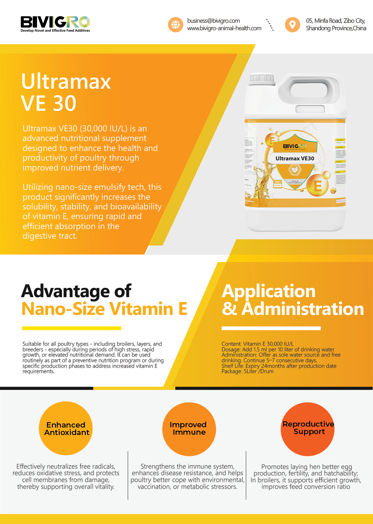Give your poultry the ultimate antioxidant defense with Ultramax Vitamin E. Our product features nano-emulsified Vitamin E oil, a highly advanced and bioavailable form that delivers superior absorption and effectiveness for stronger, healthier, and more productive chickens.