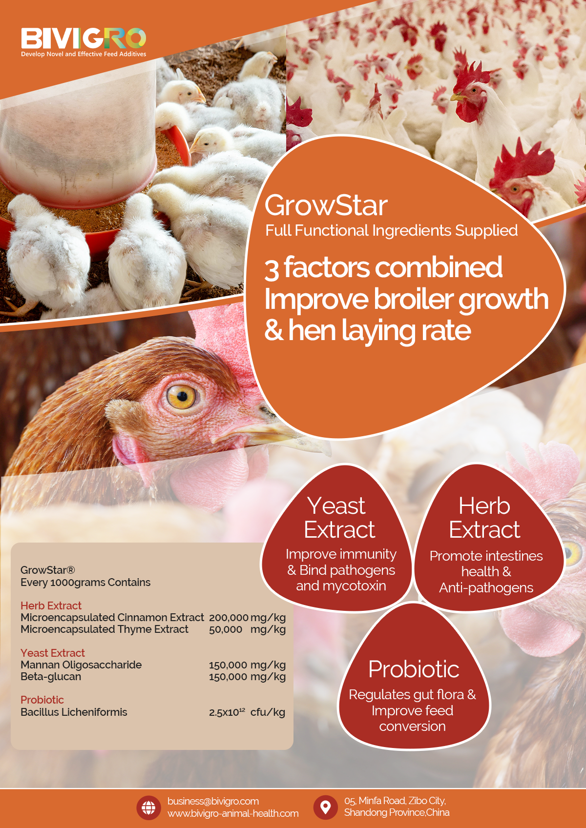 GrowStar is a new generation poultry growth booster designed to directly boost profitability for poultry farmers. Our unique formula combines micro-encapsulated herb extracts, premium yeast extract, and selected probiotics to work in harmony, enhancing health and driving superior production performance in both broilers and layers.