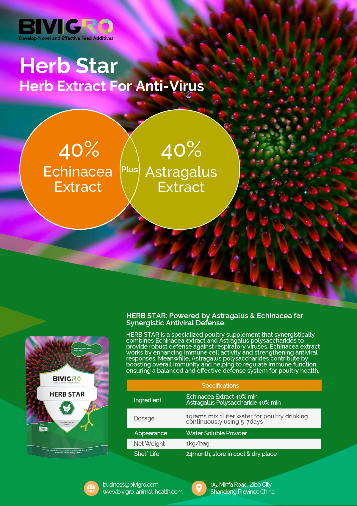Herb Star is a powerful, herb-based formula specifically designed for poultry farmers. Combining Echinacea extract and Astragalus polysaccharides, it provides targeted support for the respiratory system and strengthens the poultry overall natural defenses, offering a natural strategy for managing health and performance.