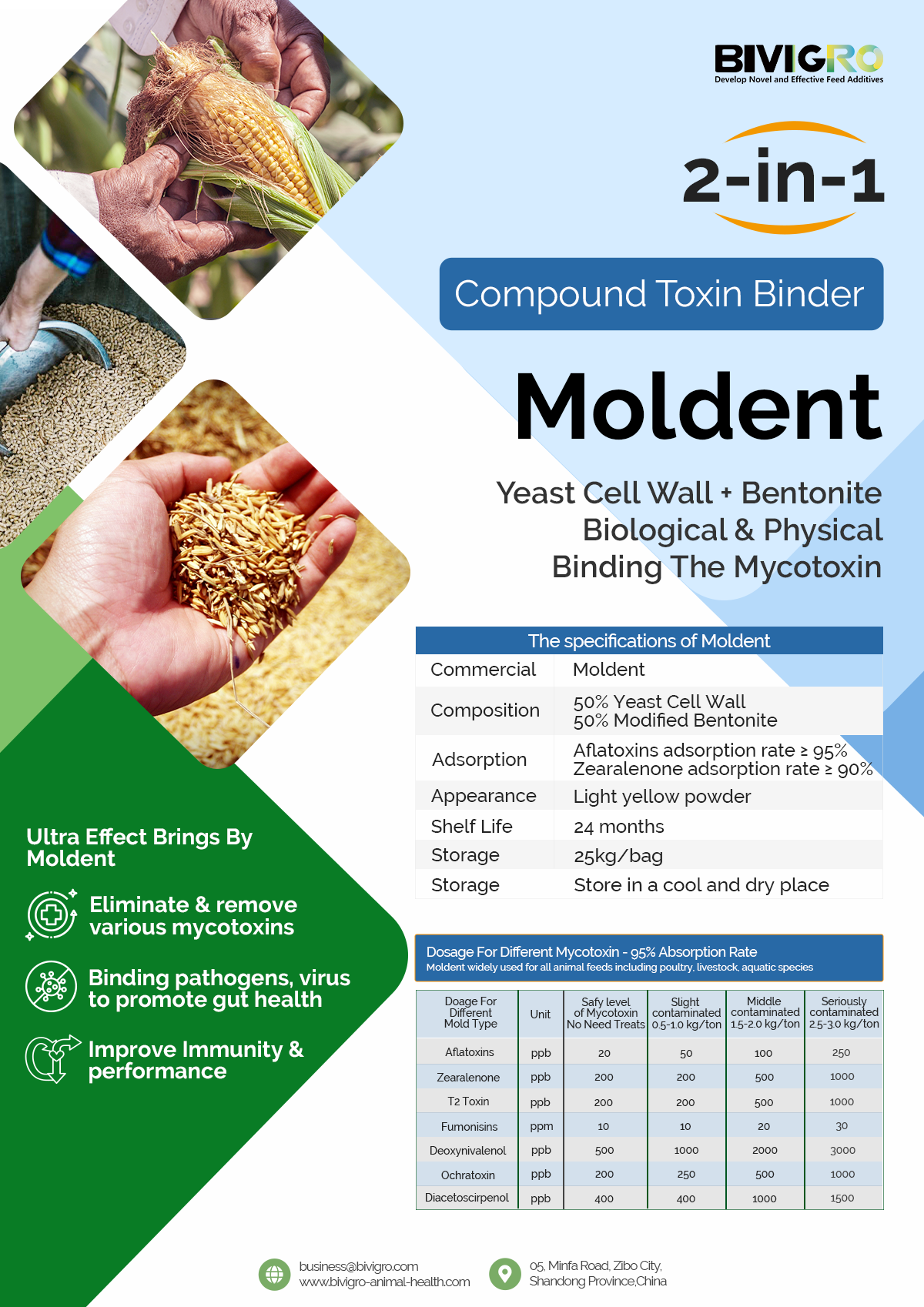 Safeguard your cattle and sheep from hidden feed threats with Mol-Dent, an advanced mycotoxin binder designed for ruminants. Our formula combines Yeast Cell Wall and Modified Bentonite, creating a powerful, dual-action solution that provides broad-spectrum protection against harmful toxins in forages and concentrates.