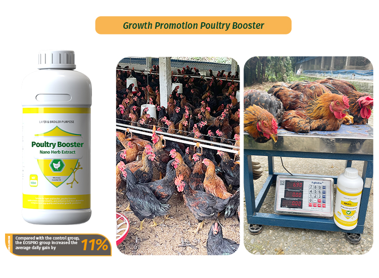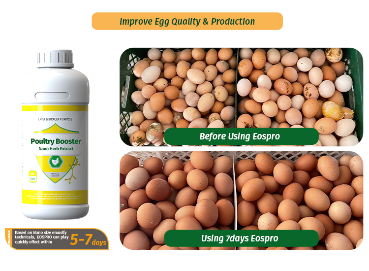 Eospro Poultry Booster, a revolutionary nano-emulsified liquid formulation developed with plant derived cinnamaldehyde and thymol, unlike conventional additives, Eospro Booster works internally to enhance poultry’s innate capacity for nutrient utilization, makes measurable improvements in egg quality, production rates, and broiler growth rate within days.