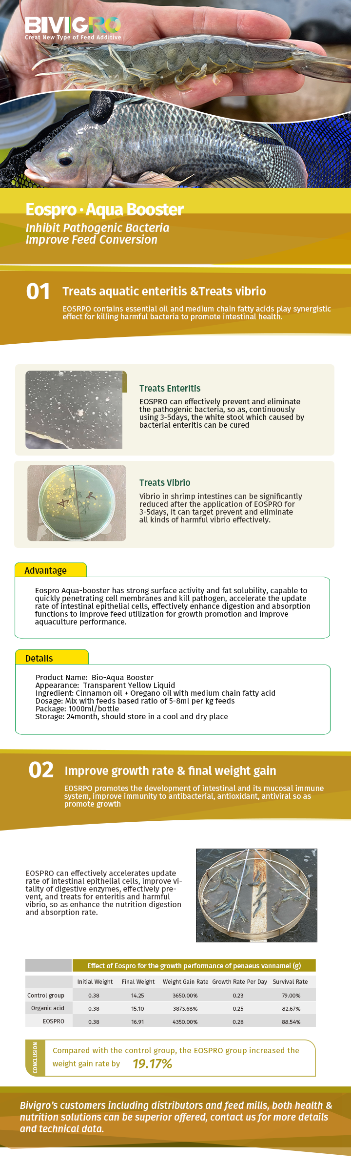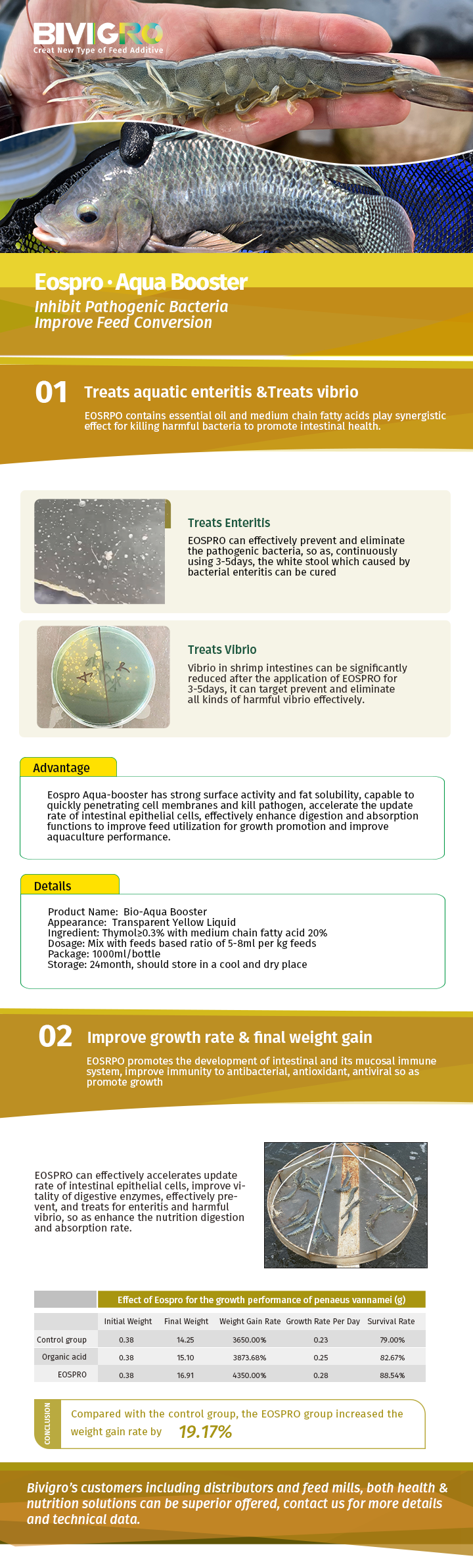 Aqua-Booster: The nano essential oil to treats enteritis and improve feed intake Related Produtcs Bio-AmiplusBio-Amiplus: Liquid Amino Acid Chelated Minerals For Aquatic Shrimp & Fish Vibrio-MasterVibrio-Master: Effectively eliminate harmful vibrio in water and shrimp body Cleantec-ProCleantec-Pro: The advanced disinfectant for high density aquatic farming Cleantec-TabletCleantec-Tablet: The disinfectant & oxygen tablet for soil pond AquaGoldAquaGold: The growth promoter granules for aquatic animals