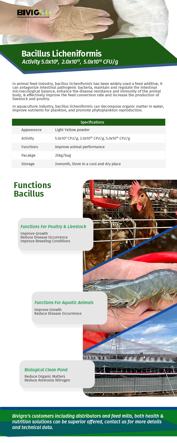 Bacillus Licheniformis: The Probiotic Strain For Improve Intestines Health Related Produtcs Bacillus subtilisBacillus Subtilis: The Probiotic Strain For Improve Animal Performance Mol-DentMol-Dent: The combined of yeast cell wall and modified bentonite to remove mycotoxin PhytasePhezyme: Feed Phytase to Release More Phosphorus & Nutritions In Animal Feeds Enzymes ComplexCozyme: Enzymes Complex Plays Synergist Effect to Decompose NSP In Animal Diets Glucose OxidaseMolzyme: Enzyme of Glucose Oxidase to Decompose & Inhibit the Damage of Mycotoxin