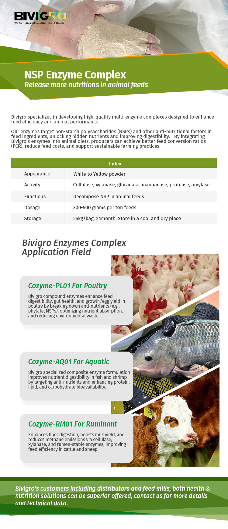 Cozyme: Enzymes Complex Plays Synergist Effect to Decompose NSP In Animal Diets Related Produtcs Bacillus subtilisBacillus Subtilis: The Probiotic Strain For Improve Animal Performance Bacillus LicheniformisBacillus Licheniformis: The Probiotic Strain For Improve Intestines Health Mol-DentMol-Dent: The combined of yeast cell wall and modified bentonite to remove mycotoxin PhytasePhezyme: Feed Phytase to Release More Phosphorus & Nutritions In Animal Feeds Glucose OxidaseMolzyme: Enzyme of Glucose Oxidase to Decompose & Inhibit the Damage of Mycotoxin