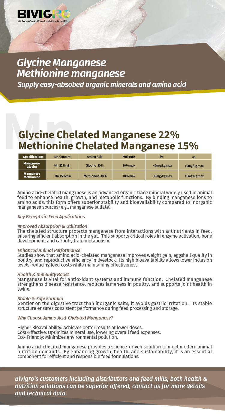 Amino Acid Chelated Manganese: Supply Organic Manganese For Animal Easy Absorption Related Produtcs Chelated CopperAmino Acid Chelated Copper: Supply Organic Copper For Animal Easy Absorption Chelated IronAmino Acid Chelated Iron: Supply Organic Iron For Animal Easy Absorption Chelated ZincAmino Acid Chelated Zinc: Supply Organic Zinc For Animal Easy Absorption Chromium PicolinateChromium Picolinate: Supply Organic Chromium For Animal Easy Absorption
