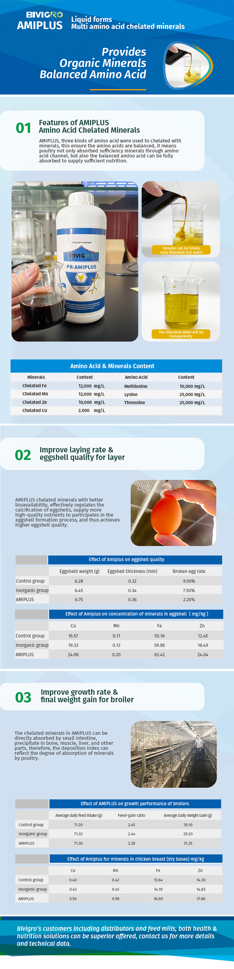 Amiplus: The multi amino acid chelated minerals liquid preparations Related Produtcs EosproEospro: The nano essential oil to improve layer laying rate & broiler growth rate Herb StarHerb Star: The echinacea extract for anti-respiratory virus for poultry Liver StarLiver Star: The silybum extract for poultry liver protection & recovery BiomixBiomix: The new type probiotic of clostridium butyricum for poultry BiomasterBiomaster: The classis combination of bacillus subtilis for poultry