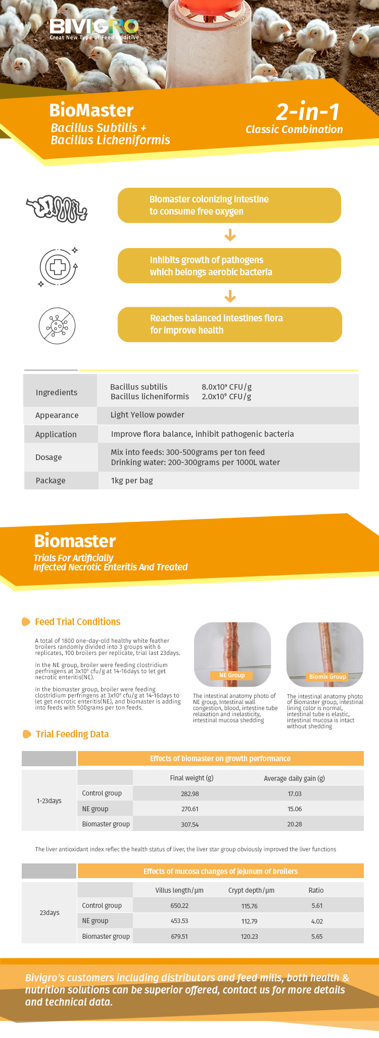 Biomaster: The classis combination of bacillus subtilis for poultry Related Produtcs AmiplusAmiplus: The multi amino acid chelated minerals liquid preparations EosproEospro: The nano essential oil to improve layer laying rate & broiler growth rate Herb StarHerb Star: The echinacea extract for anti-respiratory virus for poultry Liver StarLiver Star: The silybum extract for poultry liver protection & recovery BiomixBiomix: The new type probiotic of clostridium butyricum for poultry